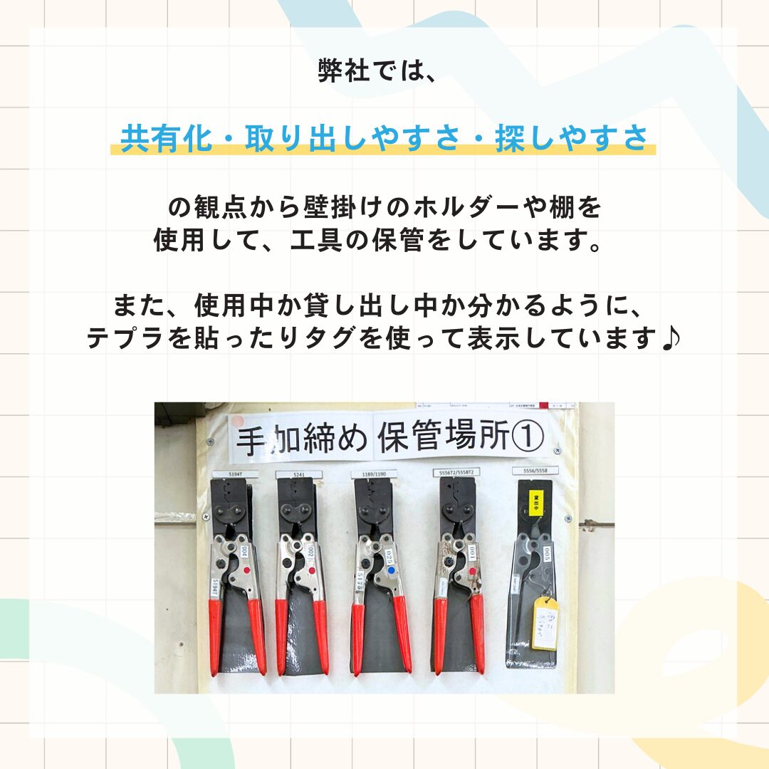 【豆ちしき】設備保管のコツ②豆知識汎用工具豆知識工具保管今回は「 設備保管のコツ」について二回目のご紹介です🙌💡端子の保管方法弊社では、『共有化・取り出しやすさ・探しやすさ』の観点から壁掛けのホルダーや棚を使用して、工具の保管をしています。また、使用中か貸し出し中か分かるように、テプラを貼ったりタグを使って表示しています♪その他製造に関する弊社の強みは試電HPの「試電の強み」よりご覧いただけます!ぜひ一度ご覧頂いた上でお問い合わせください。 お問い合わせ 一覧へ戻る圧着実績製作事例豆知識