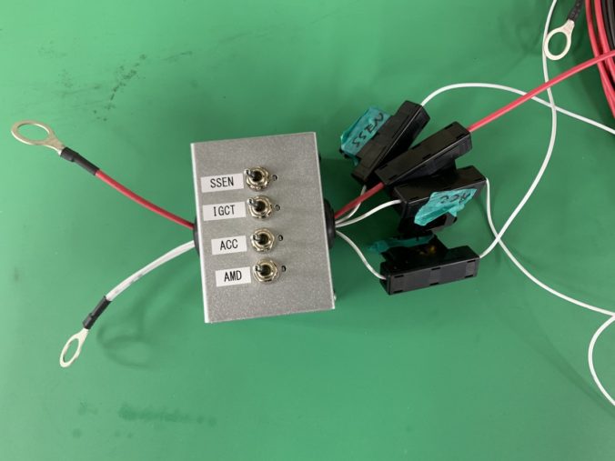 ハーネスの試験を行うために、特定の回路を意図的に断線させたいとお客様から要望がありました。回路をON、OFFするためにギボシ端子で接続しているそうで、設備を止めて試験する必要があり時間がかかる、とお悩みでした。そこで小型のアルミケースにトグルスイッチを4つ使用したスイッチボックスハーネスを提案し製作しました。回路1つ1つのON、OFFを手動でできるようになりました。各スイッチに信号名を印字し回路が分かるようにしています。